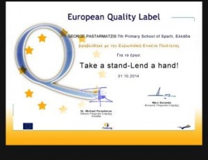 Έπειτα από διαδοχικές απονομές «Εθνικής Ετικέτας Ποιότητας» σε αντίστοιχα Ευρωπαϊκά έργα του καθηγητή Αγγλικής Γλώσσας κ. Γεωργίου Πασταρματζή, μια νέα επιβράβευση γι’ αυτόν και το 7ο Δημοτικό Σχολείο Σπάρτης, έρχεται να επιβεβαιώσει το υψηλό επίπεδο μόρφωσης που προσφέρει το Δημόσιο Σχολείο.