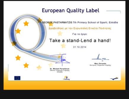 Αυτό σημαίνει πως η εργασία των μαθητών και του σχολείου έχει αναγνωριστεί στο υψηλότερο Ευρωπαϊκό επίπεδο. Σαν αποτέλεσμα, το σχολείο θα λάβει σχετικό πιστοποιητικό το οποίο μπορεί να επισυνάψει στην ιστοσελίδα του και παράλληλα να το εκθέσει σε περίοπτη θέση. Επίσης, το έργο αυτό θα εμφανιστεί σε έναν ειδικό χώρο της Ευρωπαϊκής Διαδικτυακής Πύλης στο www.etwinning.net.