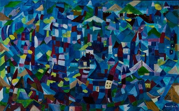 Στα 56 έργα που παρουσιάζω για πρώτη φορά κυριαρχεί με όλες του τις αποχρώσεις και παρέα με άλλα χρώματα μας ταξιδεύει σε αγαπημένες στιγμές δημιουργίας, που αφορούν τον άνθρωπο, το ταξίδι, την θάλασσα.