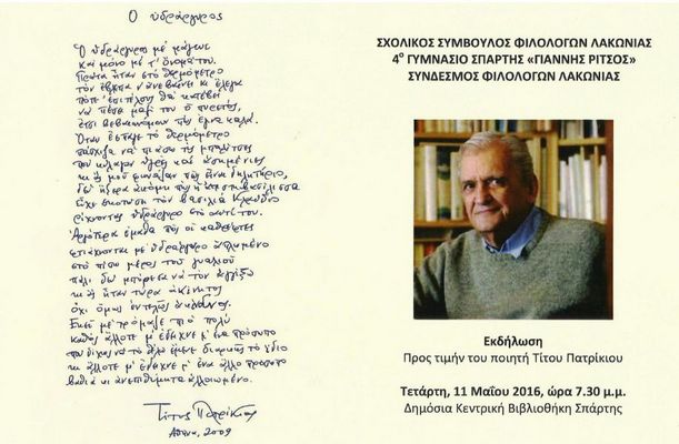 Η πρώτη, στο 4ο Γυμνάσιο Σπάρτης «Γιάννης Ρίτσος», στις 11 π.μ., όπου ο ποιητής Τίτος Πατρίκιος θα συζητήσει με εκπαιδευτικούς και μαθητές θέματα σχετικά με την ποίησή του. Η δεύτερη, στη Δημόσια Κεντρική Βιβλιοθήκη Σπάρτης, στις 7.30 μ.μ., θα έχει ως θέμα την ποίηση και την ποιητική του Τίτου Πατρίκιου.