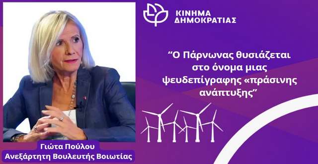 Με ερώτηση που κατέθεσε στη Βουλή προς τον Υπουργό Περιβάλλοντος και Ενέργειας η Ανεξάρτητη Βουλευτής Βοιωτίας Γιώτα Πούλου, μαζί με τους Ανεξάρτητους Βουλευτές – μέλη του Κινήματος Δημοκρατίας, αναδεικνύουν το μείζον θέμα που έχει προκύψει με την εγκατάσταση ανεμογεννητριών στον Πάρνωνα.