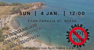 Η Ομάδα Πολιτών «Αμπελάκια SOS» απευθύνει κάλεσμα σε συλλόγους, φορείς και ενεργούς πολίτες, σε μια συγκέντρωση διαμαρτυρίας, την Κυριακή 4 Ιανουαρίου και ώρα 12:00, στην παραλία της «Αγίας Θέκλας». Αφορμή για το παραπάνω αποτελεί η απόφαση της Κτηματικής Υπηρεσίας να προχωρήσει το προσεχές διάστημα σε παραχώρηση σε ιδιώτη έκτασης 499 τ.μ. στην παραλία «Αγίας Θέκλας», καθώς και αντίστοιχης έκτασης στην …